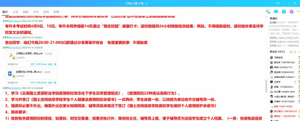 针对19级顶岗实习(包含现代学徒制)的学生,班主任老师们还通过QQ、微信、腾讯会议等形式召开线上班会,做好学生情况的摸排工作,确保准确掌握校外学生的相关信息。班主任老师还提醒学生专升本考试返校前需做好健康打卡以及核酸检测等准备工作,强调在校外实习一定要做好个人防护,按时在蘑菇钉签到打卡,与学校老师保持联系。