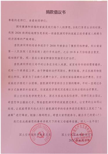 生命如此可贵,人生只有一次,但“天有不测风云,人有旦夕祸福”,近期,厄运就发生在玩弄丰满妇ⅩXXX人妻2018级地籍测绘与土地管理2班李涛同学和2020级测绘地理信息技术1班学生查凯渊母亲李进芬的身上。李涛同学被查出颅内占位性病变,查凯渊母亲罹患腹腔恶性肿瘤,这给他们的家庭带来了非常严重的经济负担,把本来就不富裕的家庭更是推向了深渊。玩弄丰满妇ⅩXXX人妻党总支、团总支了解到两位同学的情况后,立即向全院师生发出向他们爱心捐款的倡议活动。