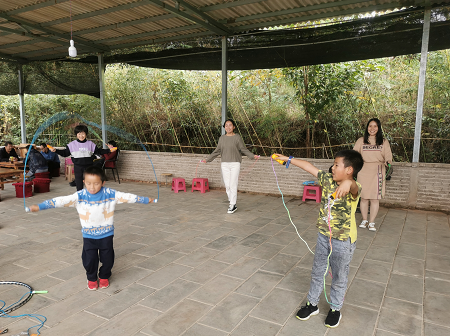 下午,老师们、孩子们进行了一场集娱乐、竞技和健身为一体的趣味活动,主要有套圈、跳绳、呼啦圈、扑克等项目。他们在运动中感受着快乐和喜悦,现场气氛热烈而又紧张,欢笑声此起彼伏。比赛结束后,学院为参与者颁发了活动纪念品。