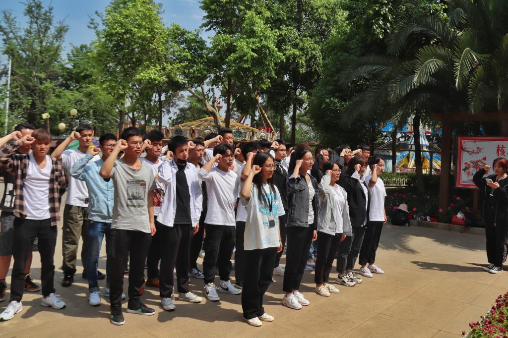 14日下午,马佳、陈宪勇两位老师带领同学们来到呈贡区三台山,首先参观了纪念壁,回顾了中国共产党走过的披荆斩棘、艰苦创业、开创新局的百年历程。接着,师生们来到英雄纪念碑前,看着矗立在公园中央的英雄纪念碑,他们无暇顾及头顶的烈日,集体三鞠躬并默哀一分钟以表示对烈士的悼念与缅怀。最后,由我院学生会主席杨文画同学领读入团誓词,同学们字字铿锵,气势激扬,那激昂的声音展现了同学们心中“凝心聚力听党话,不忘初心跟党走”的坚定信念。