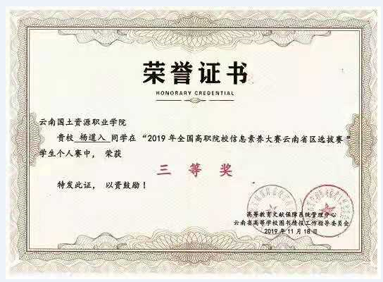 在刚刚落下帷幕的2019年全国高职院校信息素养大赛云南省选拔赛中,国土管理学院2019级国土资源调查与管理2班同学杨道入荣获省级选拔赛三等奖,并成功进入全国网络选拔赛推荐名单。