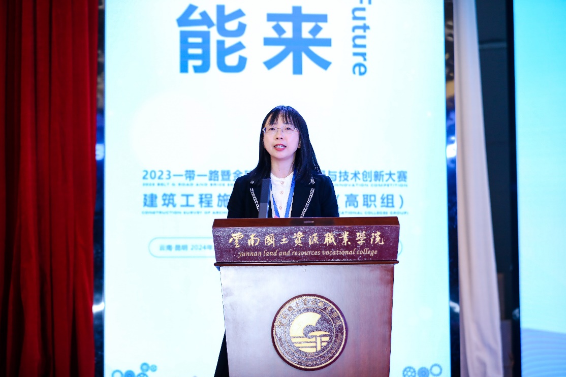 一带一路暨金砖国家技能发展国际联盟副秘书长宋小琴发表了致辞。她高度评价了本次大赛的意义和价值,介绍了一带一路暨金砖国家技能发展国际联盟的主要赛事项目和发展目标,并表示建筑施工测量赛项作为首次开设的技能赛项,将有效促进职业院校建筑施工测量专业的建设与发展,在推动技能发展与创新方面发挥着举足轻重的作用。她期待通过本次大赛,选手们能够加强交流与合作,共同开创技能发展的美好未来,预祝各参赛队取得优异成绩,本次比赛取得圆满成功。