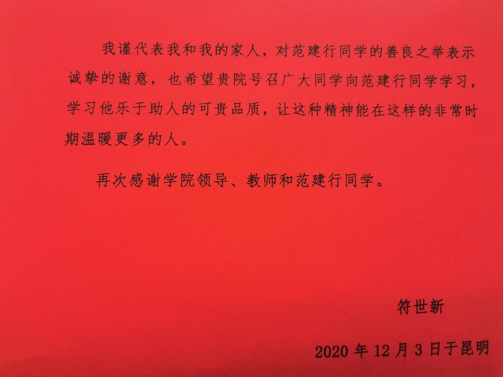 符老师对范建行同学助人为乐、见义勇为的善举表达了忠心的感谢,同时也感谢学院领导与老师对学生的培养和教育。