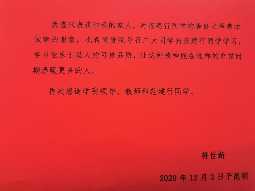 符老师对范建行同学助人为乐、见义勇为的善举表达了忠心的感谢,同时也感谢学院领导与老师对学生的培养和教育。