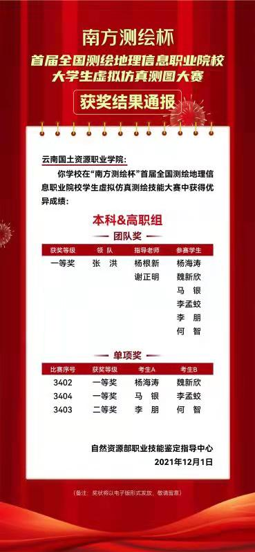 近日,由自然资源部职业技能鉴定指导中心和全国测绘地理信息职业教育教学指导委员会共同主办,重庆工程职业技术学院承办,广州南方测绘科技股份有限公司协办的“南方测绘杯”首届全国测绘地理信息职业院校大学生虚拟仿真测图大赛总决赛落下帷幕,我院师生取得团队一等奖和单项两个一等奖、一个二等奖的好成绩。