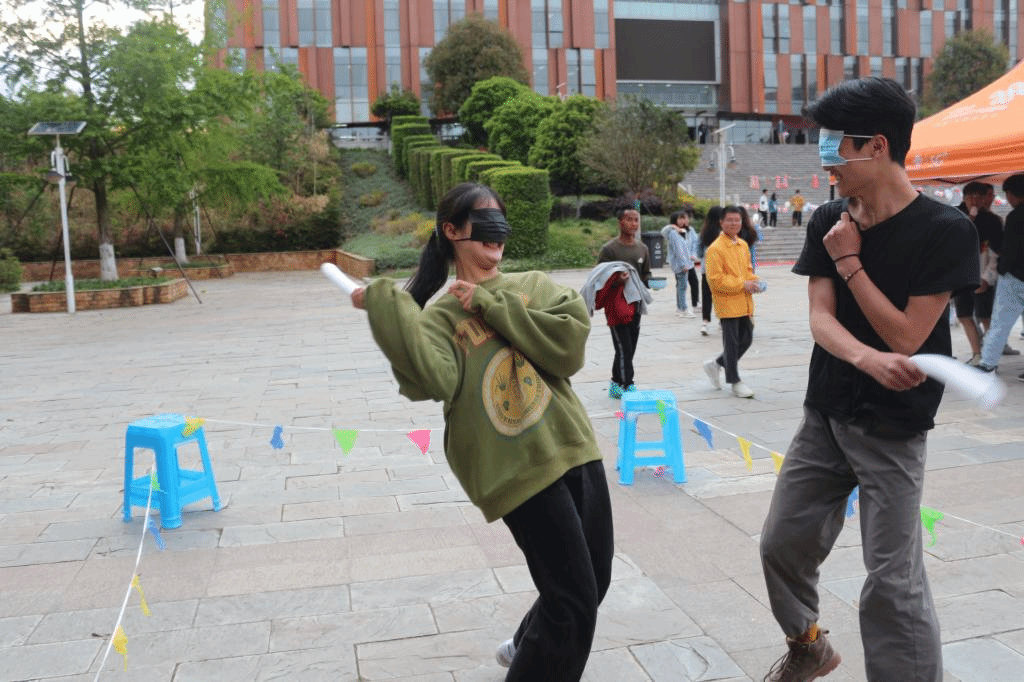 春风和煦,阳光灿烂,伴着这美好的天气,空信学院2022年清明节游园活动在国土广场准时开始啦。此次游园活动内容丰富,形式多样,同学们的参与积极性极高,各个游戏摊位前熙熙攘攘,甚至排起了长队。“蒙眼大战”吸引了好多同学加入,两两一组分别戴上眼罩,每人拿着柔软的海绵棒敲击对方,同学们身手敏捷,赢得了现场观众的阵阵欢呼。参与“小球上筷”的同学们小心翼翼地用筷子夹着乒乓球,挪着小碎步,然后将球传给另一位同学,现场紧张的氛围让观众也不由得屏住呼吸,默默为参赛者们加油。每一个看似简单的活动,都是对同学们合作能力、思维转换等的大考验。