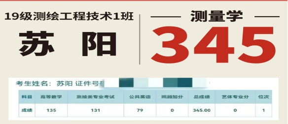 在报名专升本考试时,苏阳同学毅然决然选择了最喜欢的测绘专业,为实现自己的测绘梦不断蓄力前进。备考期间,他坚定着自己的目标,认真复习,张弛有度,提升效率。最终取得了专业总分第一名的成绩。