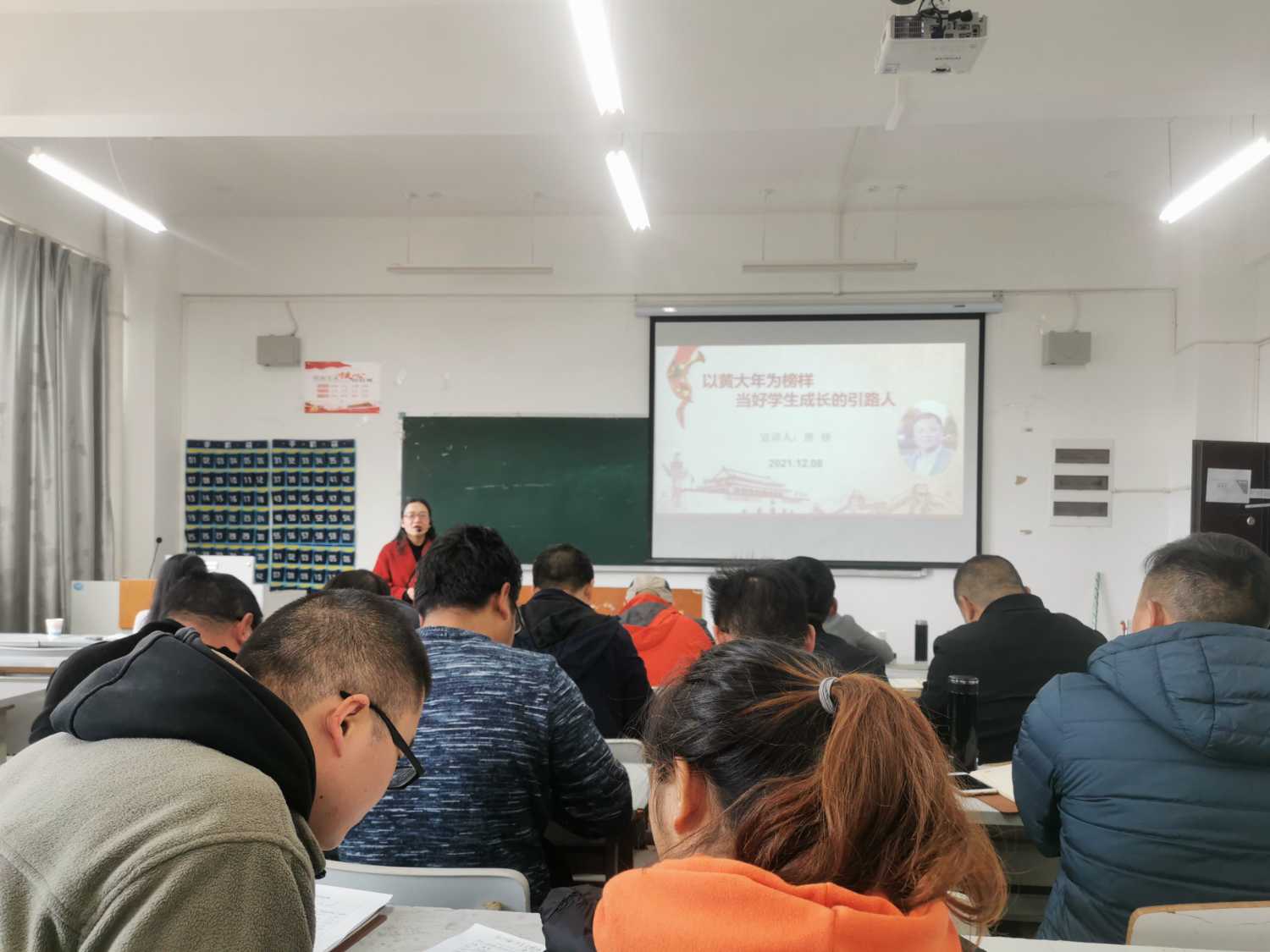 接着,唐娇老师讲授了“以黄大年为榜样 当好学生成长的引路人”。她带领老师们重温了“习近平给全国高校黄大年式教师团队代表的回信”,从“辉煌时刻回国,只因情系祖国”、“多个第一后仍争分夺秒,只为科研强国梦”、“爱生如子,培养社会主义事业的建设者和接班人”三个方面介绍了黄大年同志的先进事迹,并强调老师们要学习黄大年心有大我、至诚报国的情怀,学习黄大年的敬业精神,学习黄大年淡泊名利、一心为公的高尚情操,学习黄大年创新创造、勇攀高峰的精神,学习黄大年为党育人、为国育才的责任担当,只有这样才能当好学生成长的引路人。