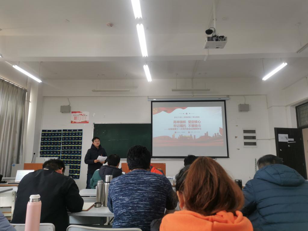 随后,陈瑞平老师讲授了“高举旗帜 坚定核心 牢记嘱托 不懈奋斗——云南省第十一次党代会精神学习”。他介绍了云南省第十一次党代会的主要内容和重要意义,强调要牢记习近平总书记考察云南重要讲话精神、重要指示批示精神和党中央的决策部署,坚持6个基本原则,努力实现“7个更”的奋斗目标。在讲到作为高校教师应如何做时,他谈到高校教师要内聚于胸、锤炼忠诚、坚定信念,外化于行、锁定目标、真抓实干,紧跟时代步伐,让十九届六中全会精神、省第十一次党代会精神在课堂教学、理论研究、学生培养等方面闪闪发光。