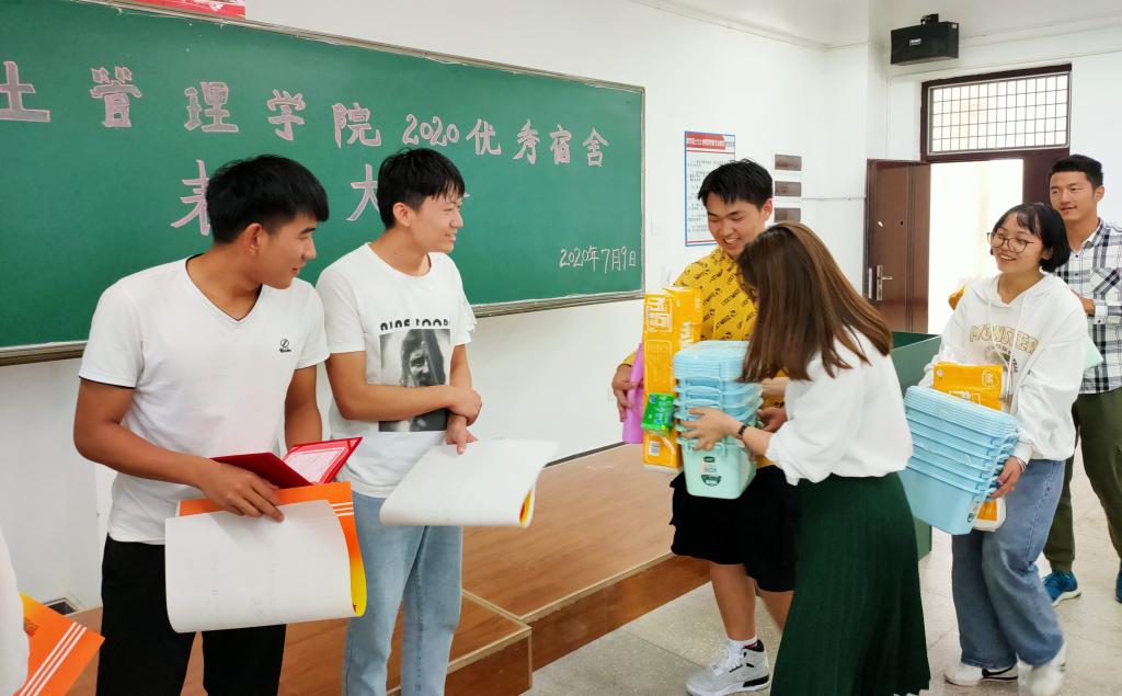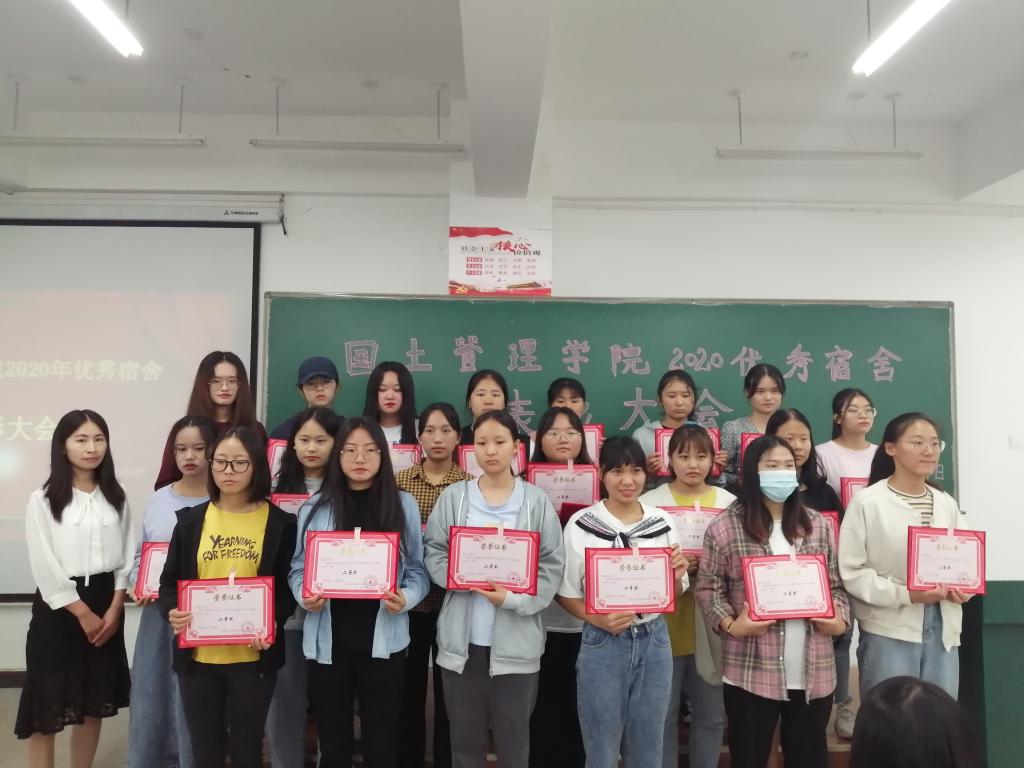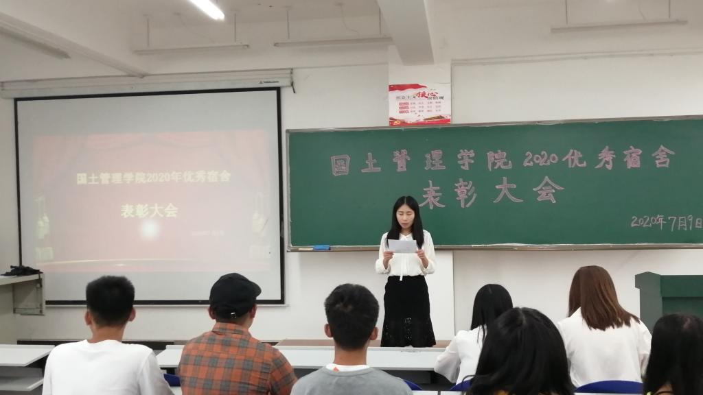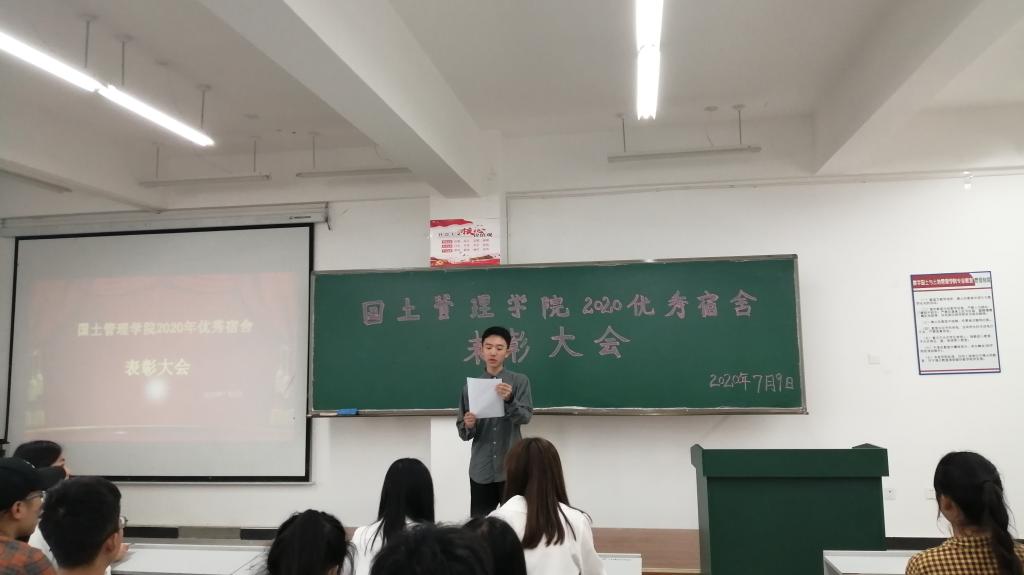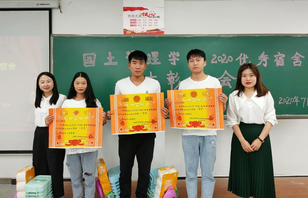 为加快学院文明建设,营造良好的宿舍环境氛围,展示我院学生宿舍的良好精神风貌,国土管理学院于2020年7月9日下午13:00在勘物楼B316举行优秀宿舍表彰大会。出席本次活动的有国土管理学院团总支副书记申锦华老师、辅导员赵烨老师、付文静老师和获奖宿舍代表。