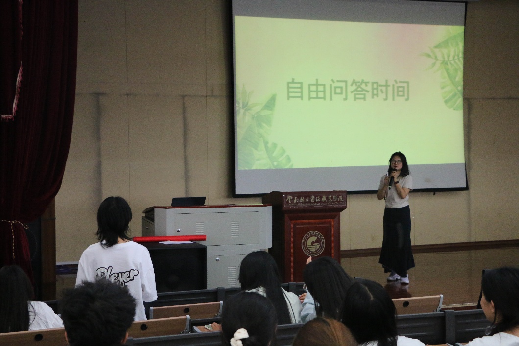 活动现场,段锡花从个人情况、考前准备、备考经验、考前注意事项等方面向同学们介绍了自己的求学历程。她强调,做好自我评估是明确人生目标的重要前提。她建议同学们要深入了解自身教育背景、能力、特长和兴趣,通过客观的自我评价来认识自己的优势和不足,进而找到适合自己的发展道路,设定清晰而实际的目标。