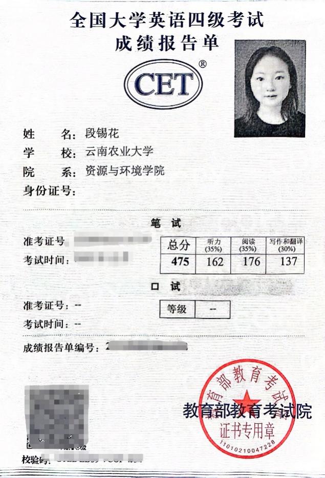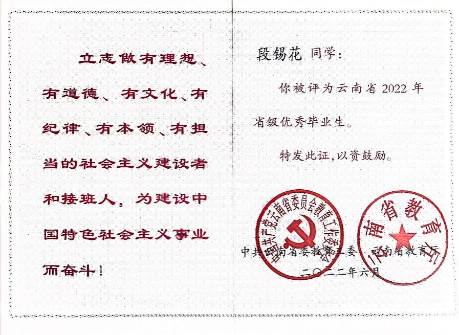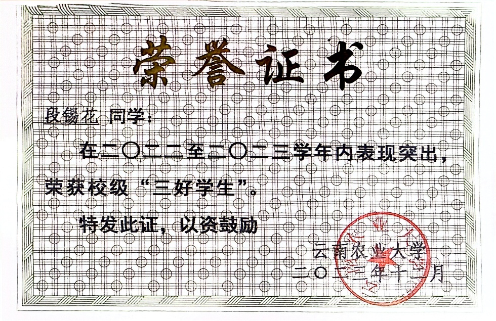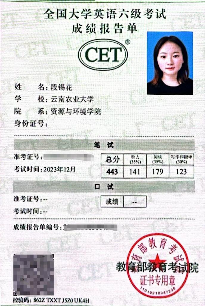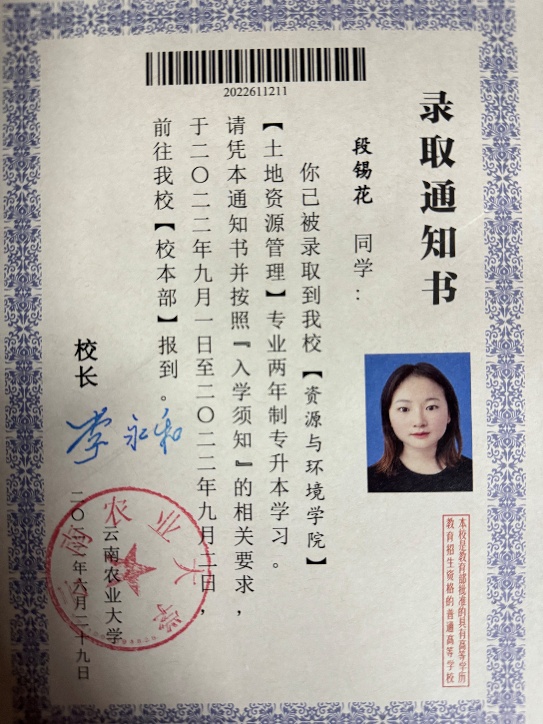 2022年8月,她以总分293.5分,排名17的好成绩考入云南农业大学。来到本科院校的她,并未就此止步,她清晰地知道自己的方向和目标——考研。为此,她全身心投入学习,除加强专业知识学习外,还先后通过CET四级、六级考试,因学习成绩优异,曾获云南农业大学校级“三好学生”、“优秀团员”、“优秀毕业生”等称号。