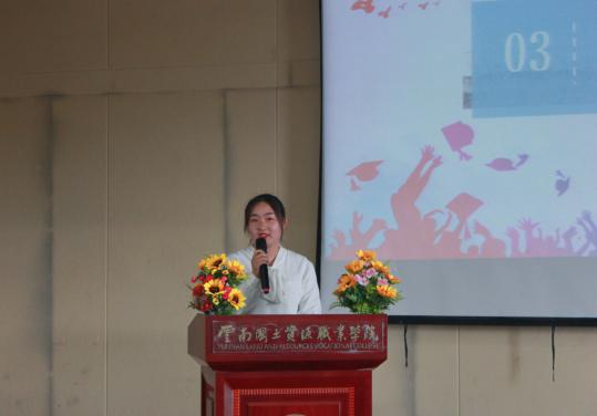 毕业生代表陈鹏艳代表全体毕业生与学院、与朝夕相处的老师同学们道别,并表示了对老师和父母深深的感谢。她表示将会以最饱满的热情勇敢地面对各种挑战,脚踏实地,勇于创新,不断进取,努力实现自己的人生价值,不辜负学校和老师的殷切期望。此外,她还鼓励学弟学妹们要真正做到 “明德尚能,学以致用 ”。