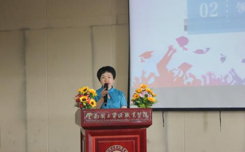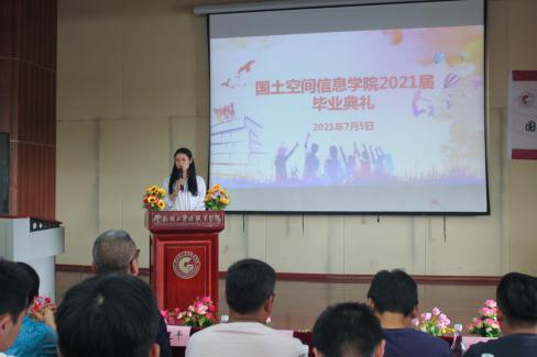在庄严的国歌声中,毕业典礼拉开序幕。随后,高昆老师为此次典礼致辞,她代表学院向全体毕业生表示最热烈的祝贺,向为学生成长成才付出心血汗水的老师们表示衷心的感谢,向关爱支持学院事业发展的企业表示崇高的敬意。接着,高老师强调今年是中国共产党成立100周年,毕业生们生逢盛世、肩负重任。她寄语广大毕业生:一要“立大志”,为实现第二个百年奋斗目标努力奋斗,为实现社会主义现代化强国贡献自己的力量;二要“明大德”,牢记学校“质朴宽厚 崇实笃行”的大学精神;三要“担大任”,勇做走在时代前列的奋斗者和开拓者 。