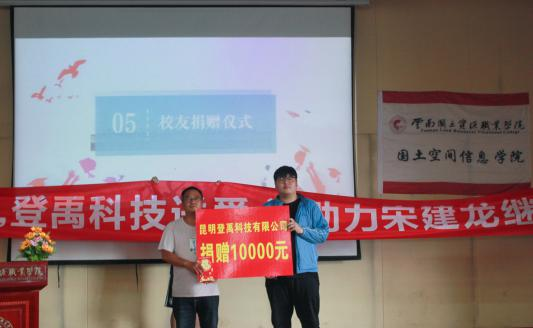 学院2003级测绘工程专业优秀校友、现任昆明登禹科技有限公司总经理李兴华为2018级国土资源调查与管理4班宋建龙同学资助捐款,助力宋建龙同学继续深造。